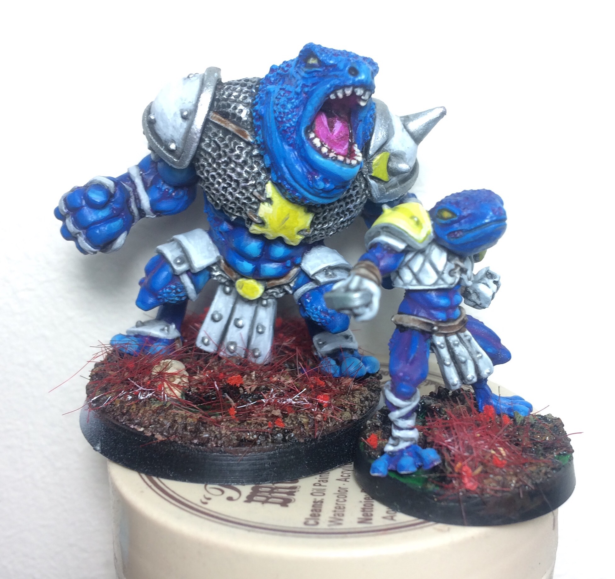 All that is left on these two models I think, is the edge highlights on the brown, and the edge colour on the bases. I am not sure what I am going to do, paint them team colours, red to contrast, or to match the base colour. Next to be painted is the Coach and staff I think. I am going to paint the Coach as a green frog I think. Mix it up a little, he doesn’t have to be the same breed as the team does he? If not green, white and grey like the frog above. These models are really enjoyable to paint. They are clearly defined in the sculpt, so easy to paint neat and clear.