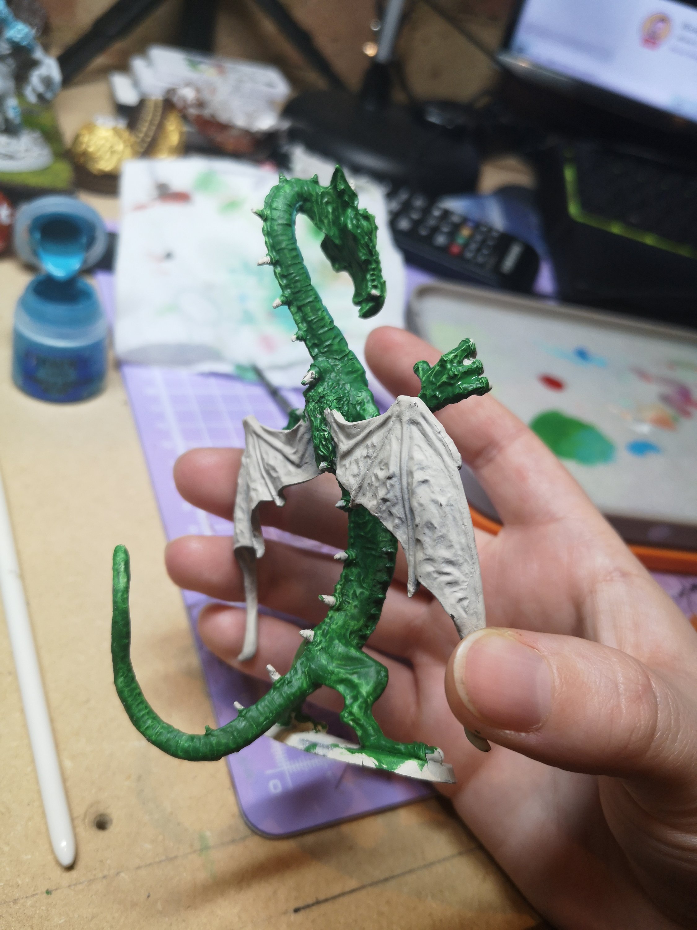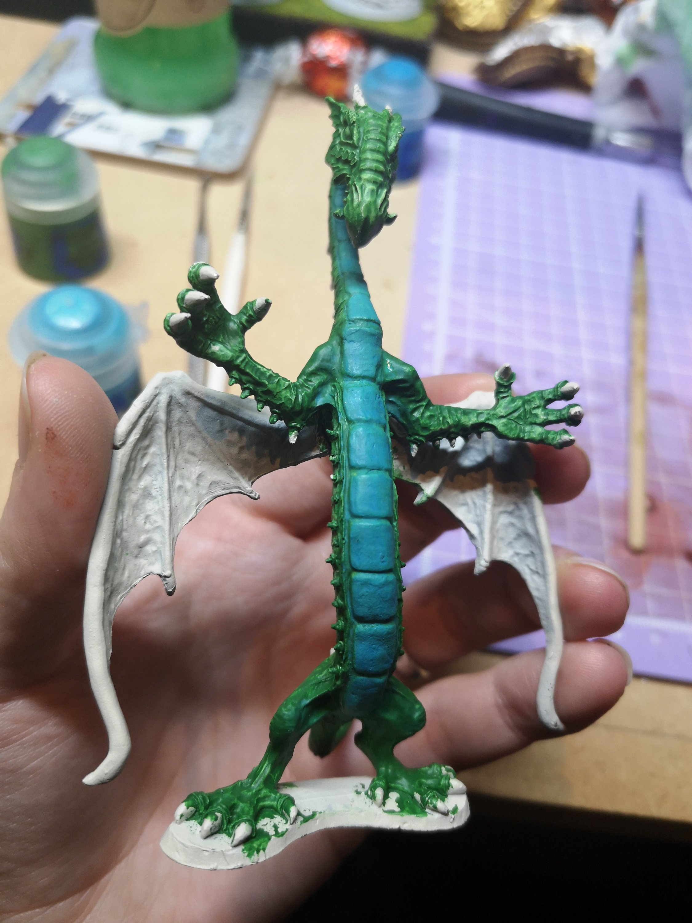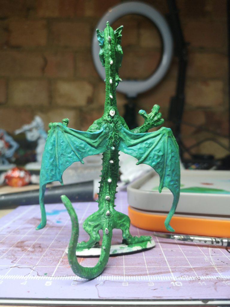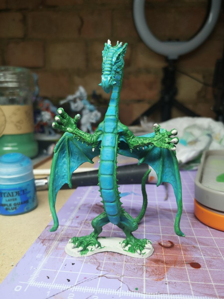 So far, if used Warpstone glow and Temple Guard Blue. The next levels will be Moot Green and Baharroth Blue. Nothing complicated so far, just layers, back and forth. I’m not 100% sold on where the colours are at the moment, specially on the dragon head.